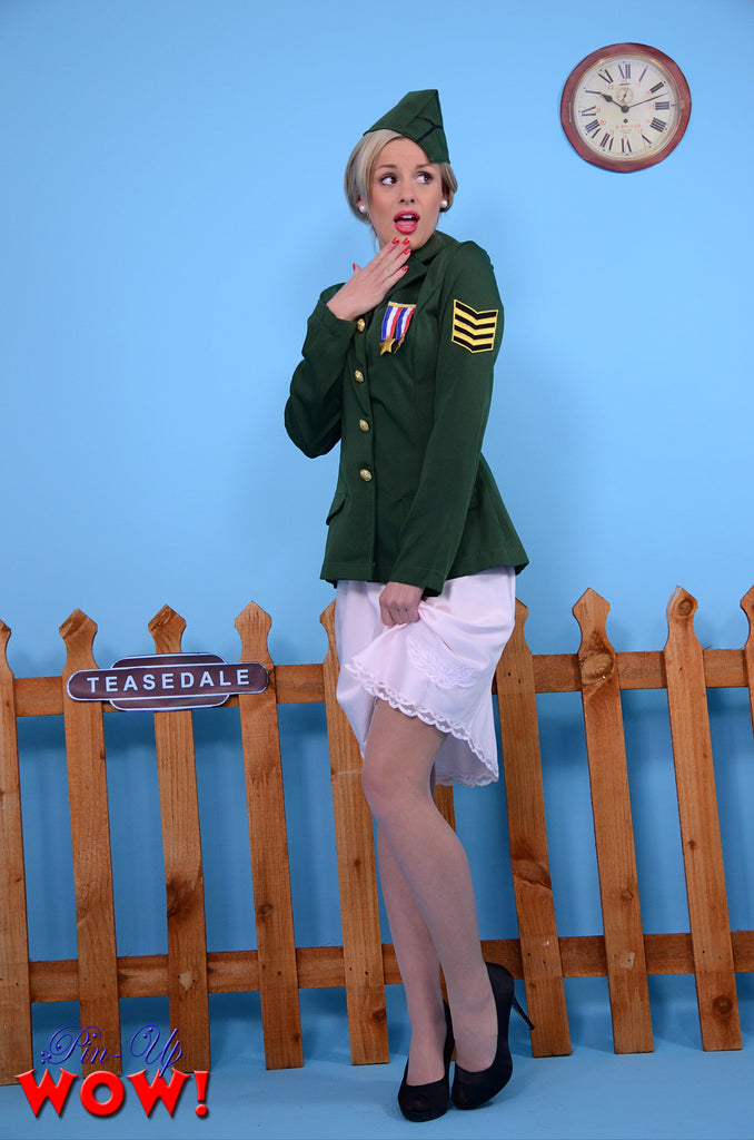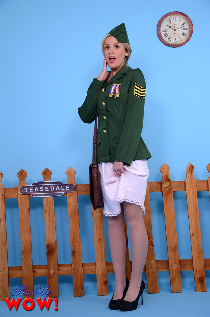 Duty calls, and heavenly Amy Green has to catch the 10.15 to get back to camp, but no one has warned her about the Teasedale Express. Her it comes now at full pelt! Looks like Amy won’t be the only soldier standing to attention!