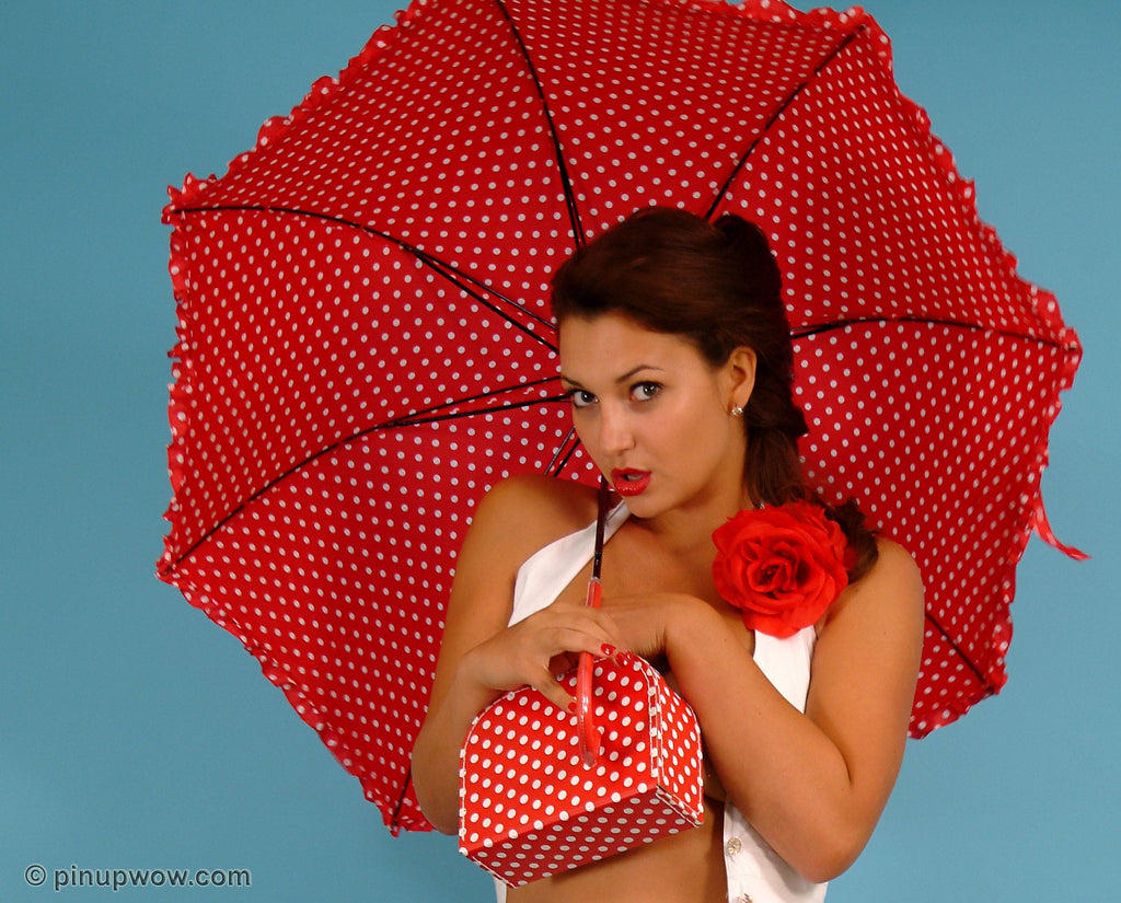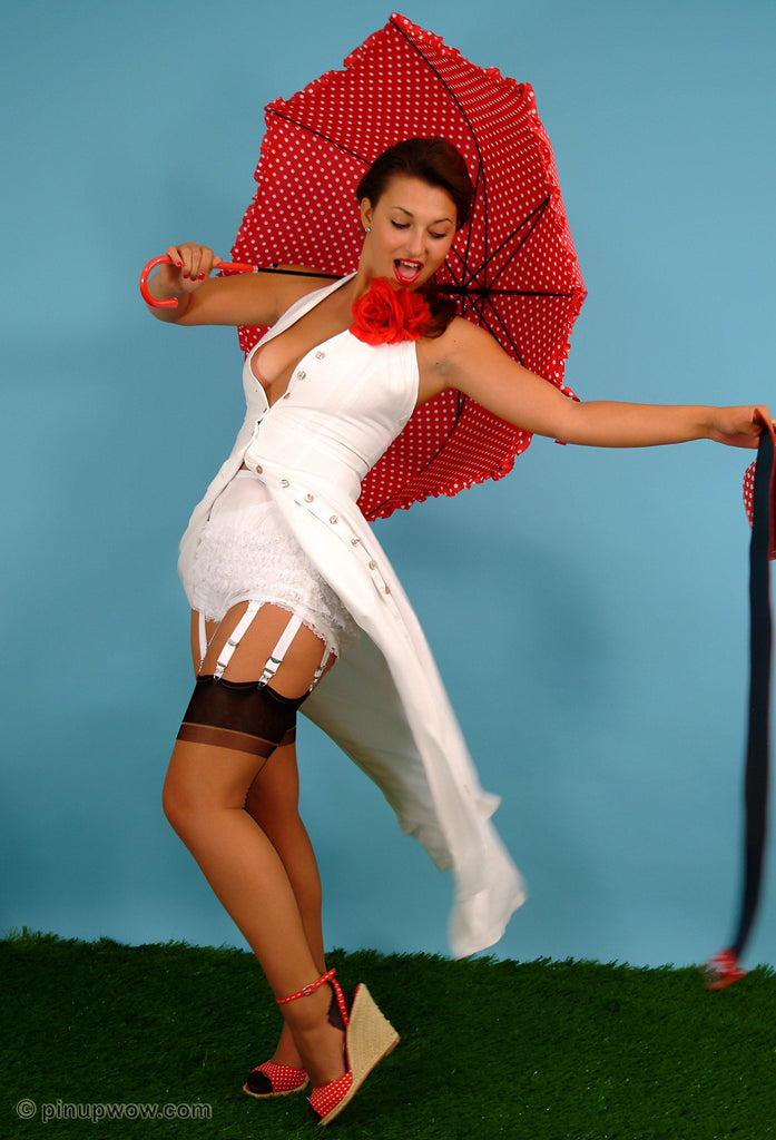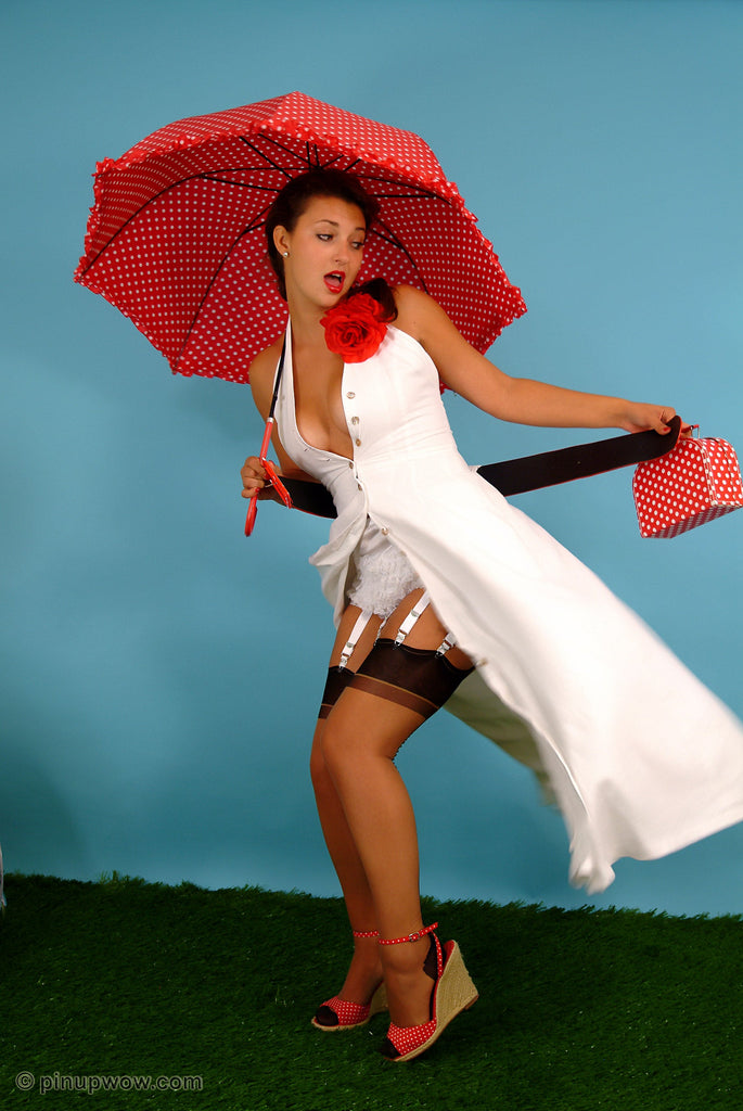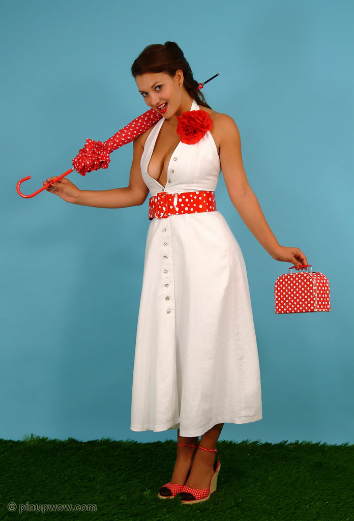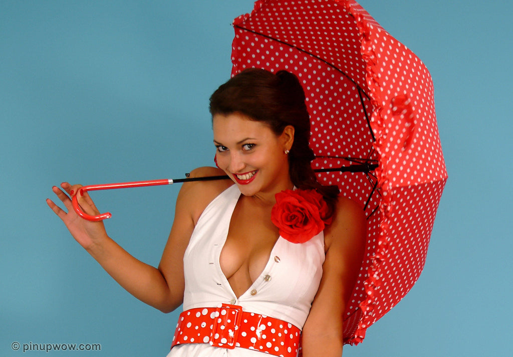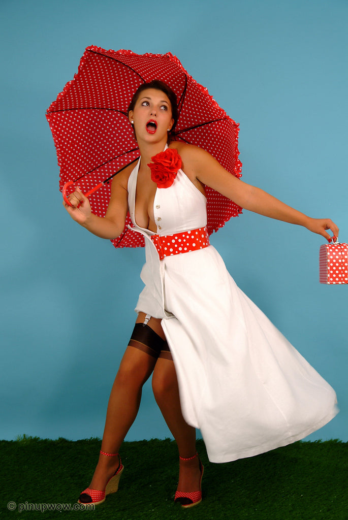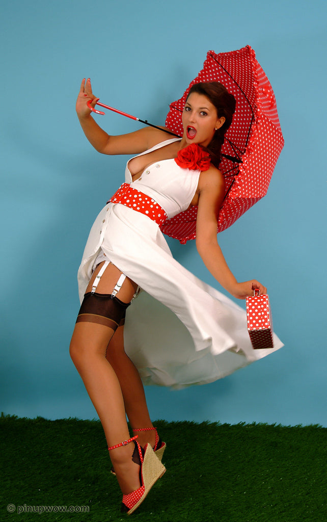 Glamorous Pin-Up Amiee should have taken a closer look at the weather before wearing such a revealing red polka dot summer combination. But that naughty glint in her lovely eyes tells us she knows exactly what will happen when the wind begins to blow!