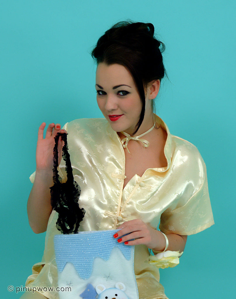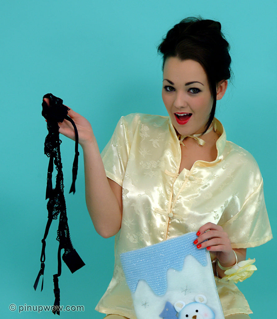 Saucy Pin-Up Jodie is delighted to discover sexy lingerie in her Christmas stocking. But we are even more delighted when she decides to give us the perfect present by taking her pyjamas off to try it all on!