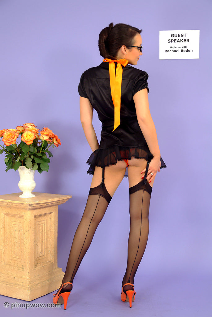 Mademoiselle Rachael has been invited to give a speech to an audience that have helped themselves to far too much red wine over lunch. Of course a short skirt and seamed black nylon stockings can be distraction, but what can she do to gain their full attention? If ever there was a Pin-Up WOW girl who can combine a Speech with a Striptease, it's Rachael!