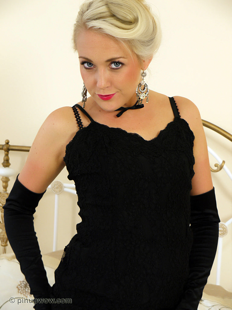 Delectable Pin-Up Lucy-Anne is stretched across her bed in sexy black lingerie and seamed nylon stockings. She is ready to treat you by removing her clothes in a very sexy bedroom tease. Surely this is no time to keep such a pretty girl waiting?